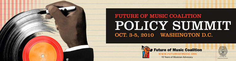 The Future of Music Coalition, a national nonprofit organization dedicated to education, research and advocacy for musicians, is holding their 10th anniversary Music Policy Summit October 3-5, 2010, at Georgetown University. The summit unites recording industry artists and insiders with policymakers, technologists and representatives of the media to tackle issues at the intersection of music, technology, policy and the law. This year the conference will feature presentations by luminaries such as Grammy and Academy Award-winning composer T-Bone Burnett, OK Go frontman Damian Kulash (of my favorite video of the year so far), Tommy Boy Entertainment CEO Tom Silverman, Pandora founder Tim Westergren, Calexico frontman Joey Burns, and Wonkette founding editor and current GQ Washington correspondent Ana Marie Cox.